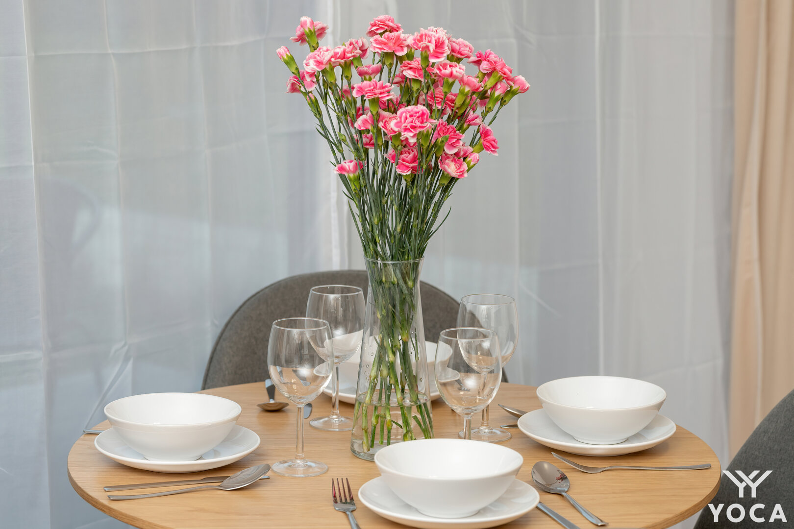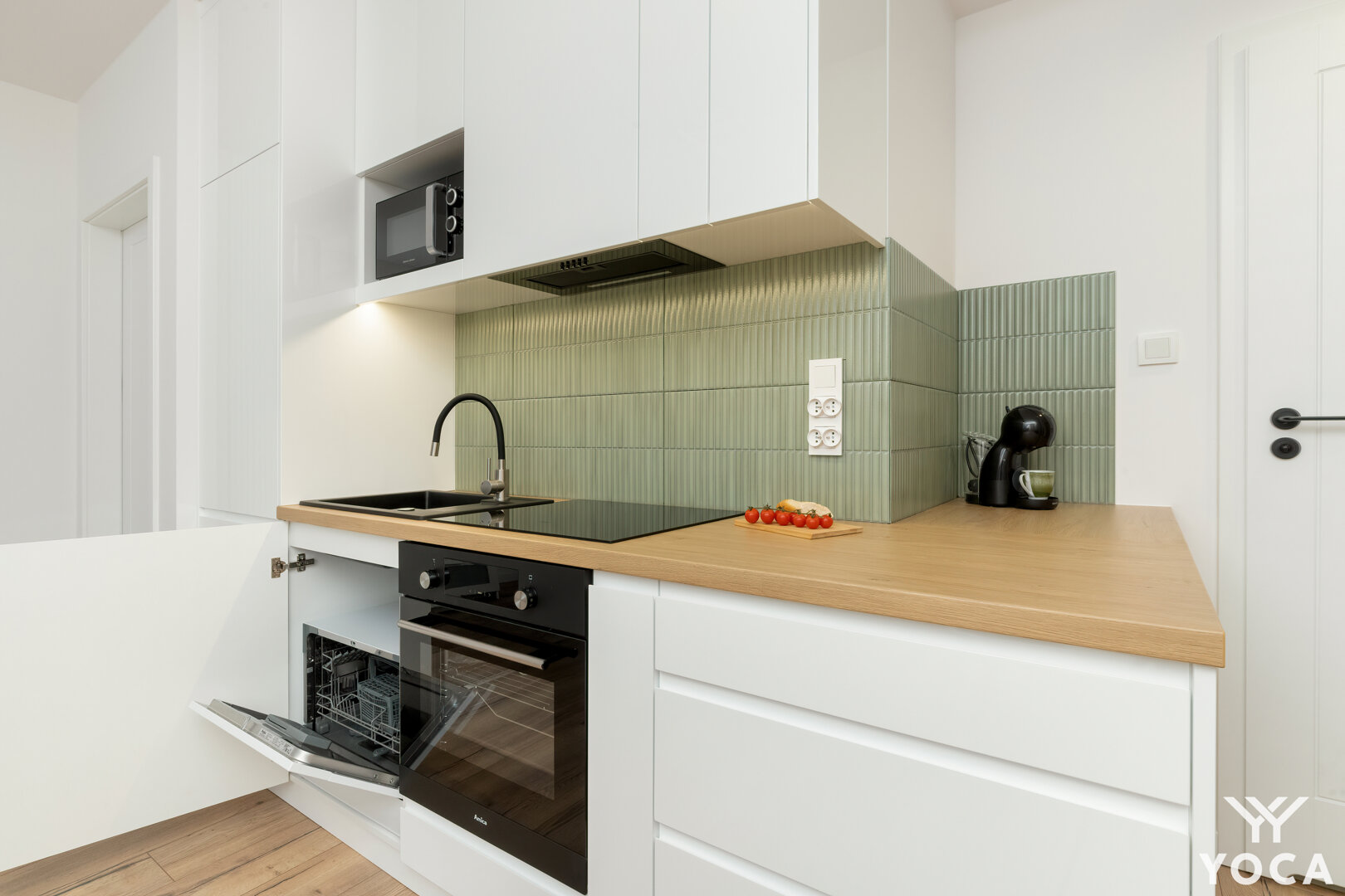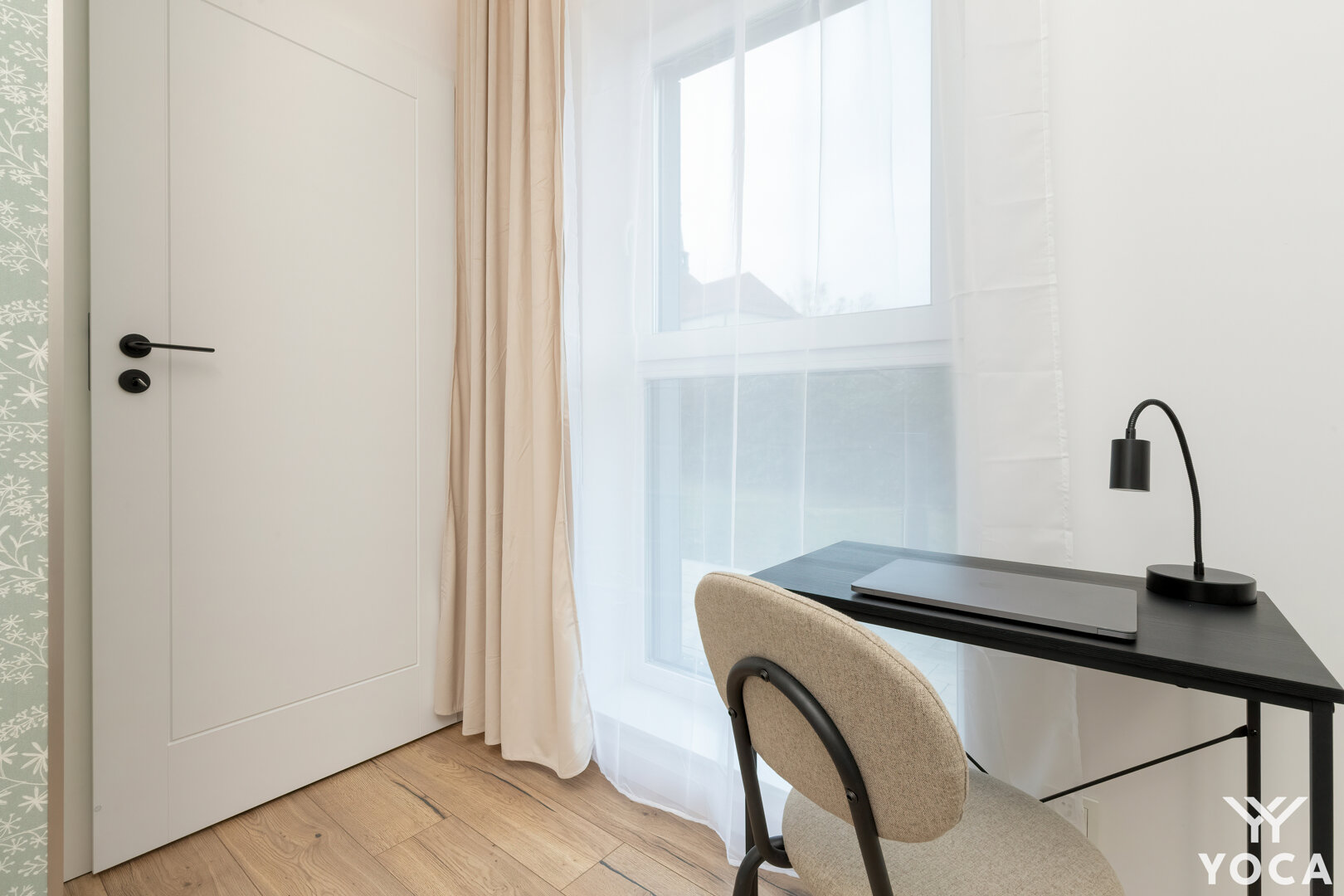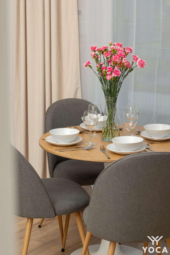 Jest to nowocześnie urządzone i przytulne cztero-pokojowe mieszkanie wyposażone w najpotrzebniejsze przedmioty. We wspólnej kuchni goście znajdą wszystkie niezbędne przedmioty to przygotowania oraz konsumpcji posiłków.